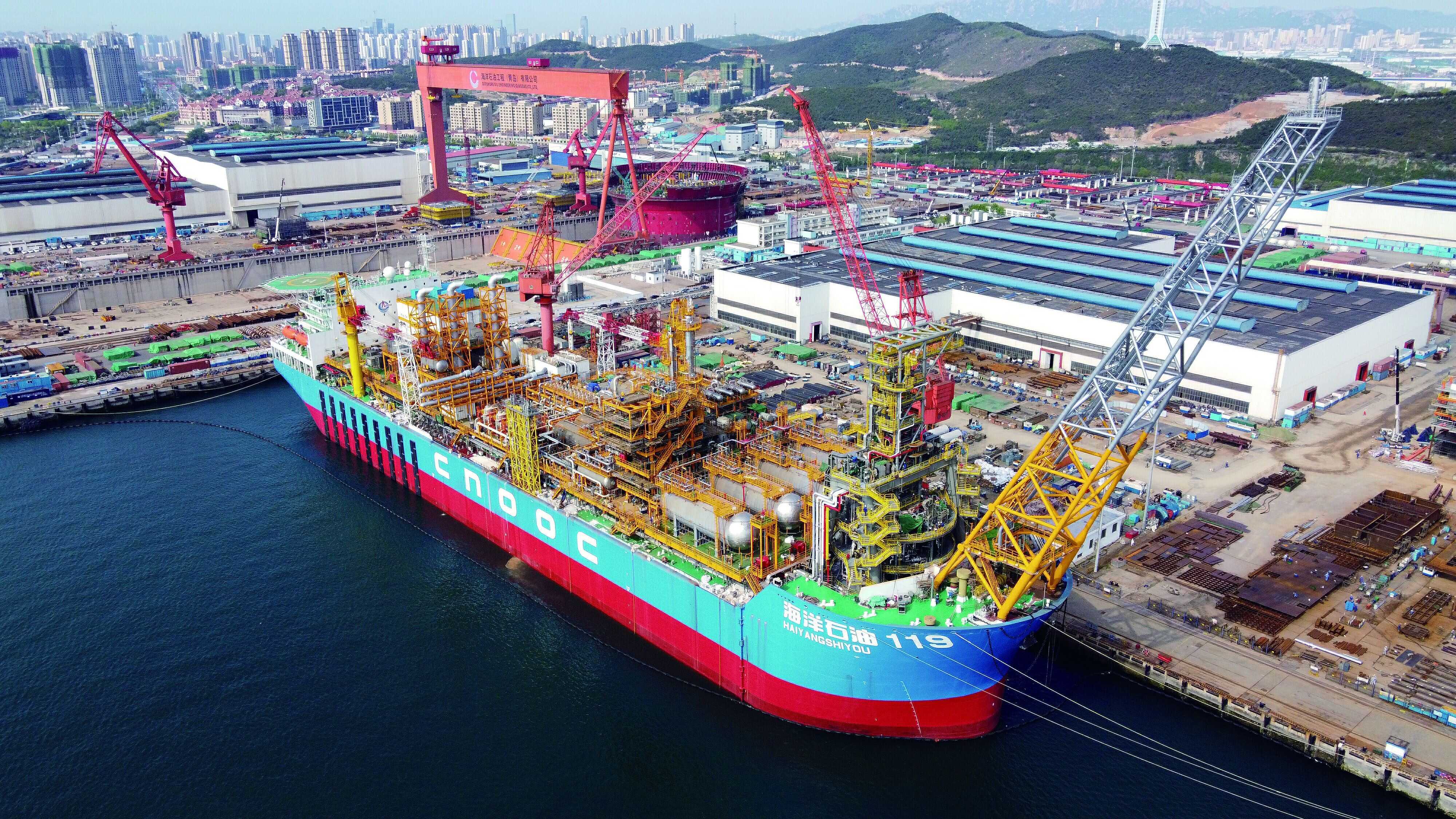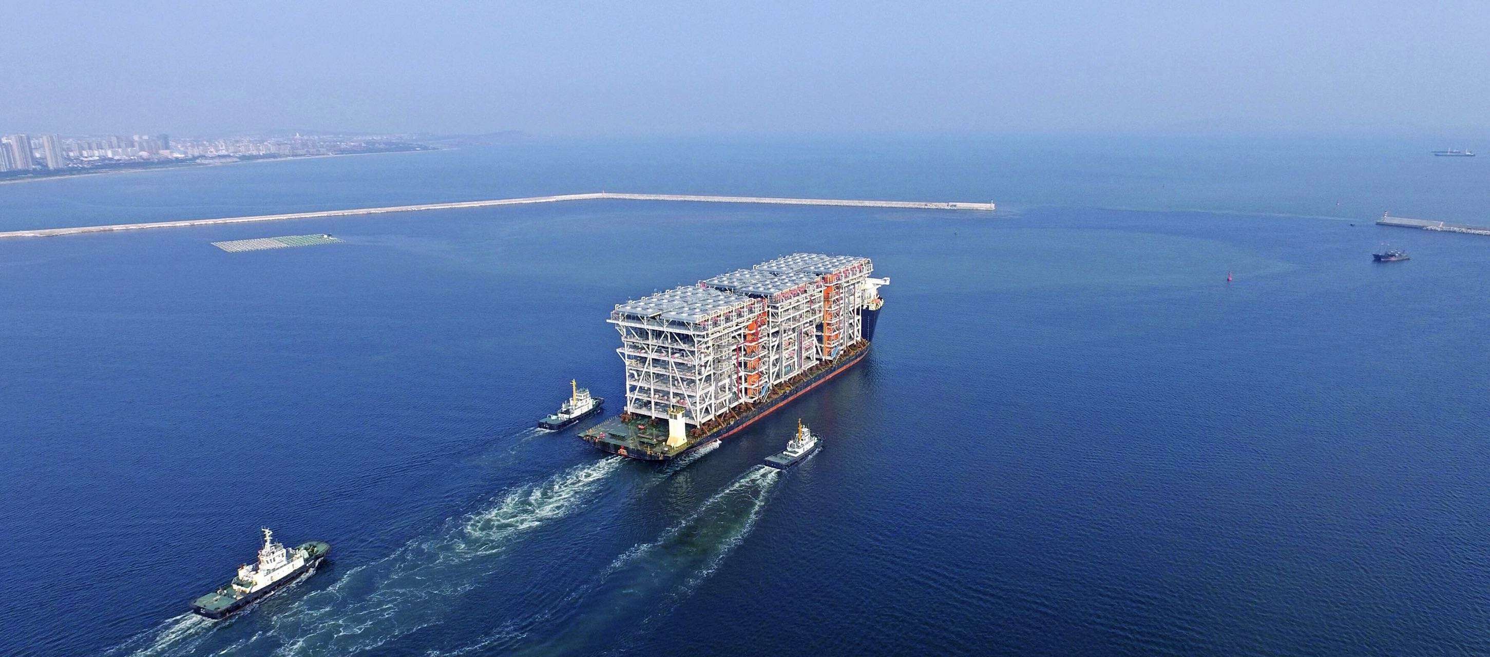 我國(guó)渤海最大海上油氣平臺(tái)—— 墾利10-2油田群開(kāi)發(fā)項(xiàng)目(一期) 中心處理平臺(tái)在山東青島離港起運(yùn)