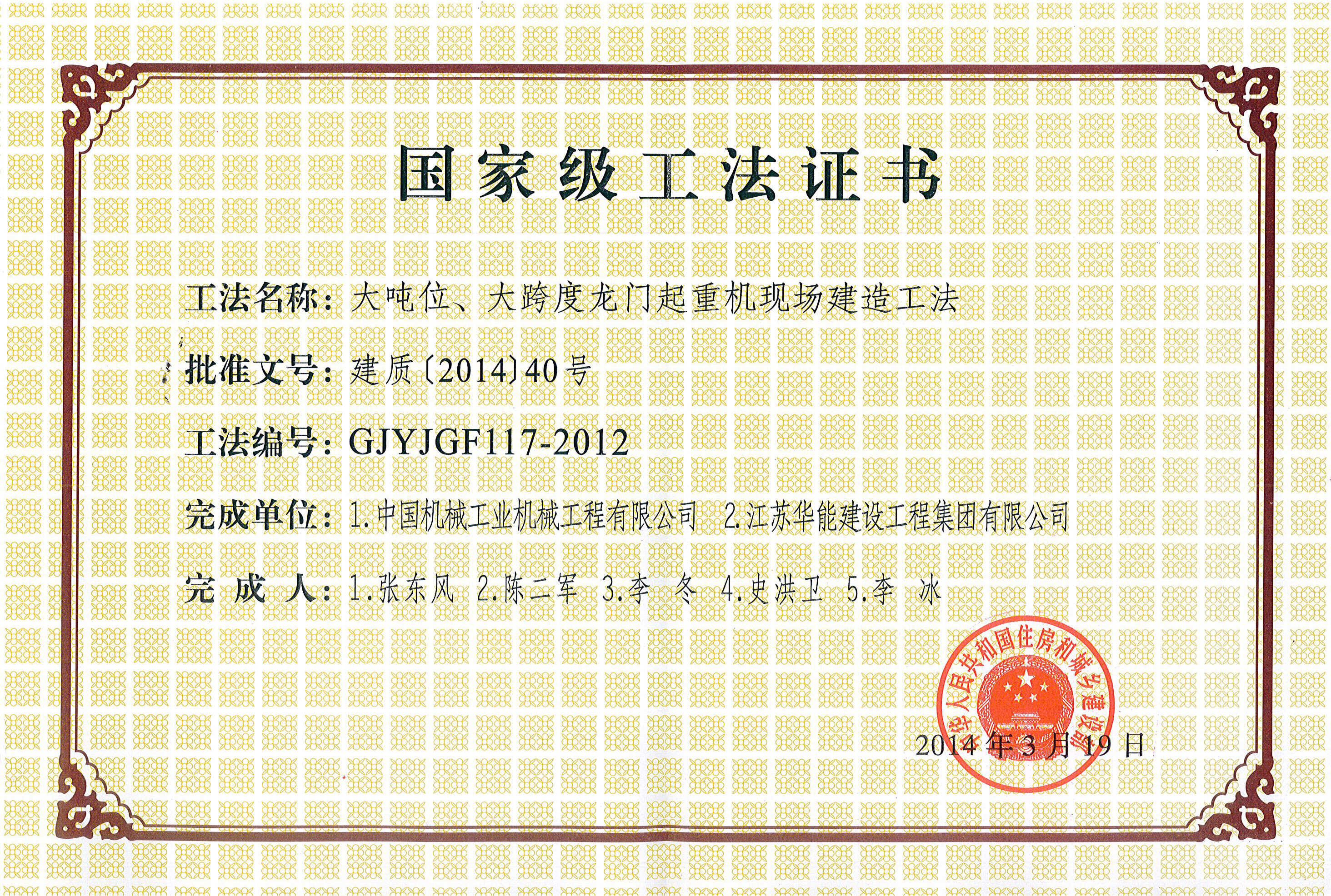 國(guó)家級(jí)大噸位、大跨度龍門(mén)起重現(xiàn)場(chǎng)建造工法證書(shū)