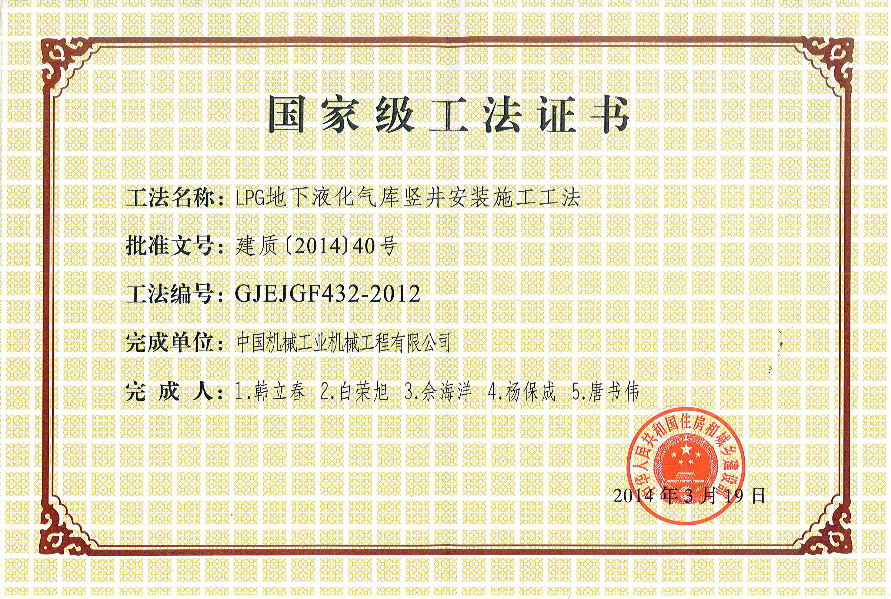 國(guó)家級(jí)LPG地下液化氣庫(kù)豎井安裝施工工法證書(shū)